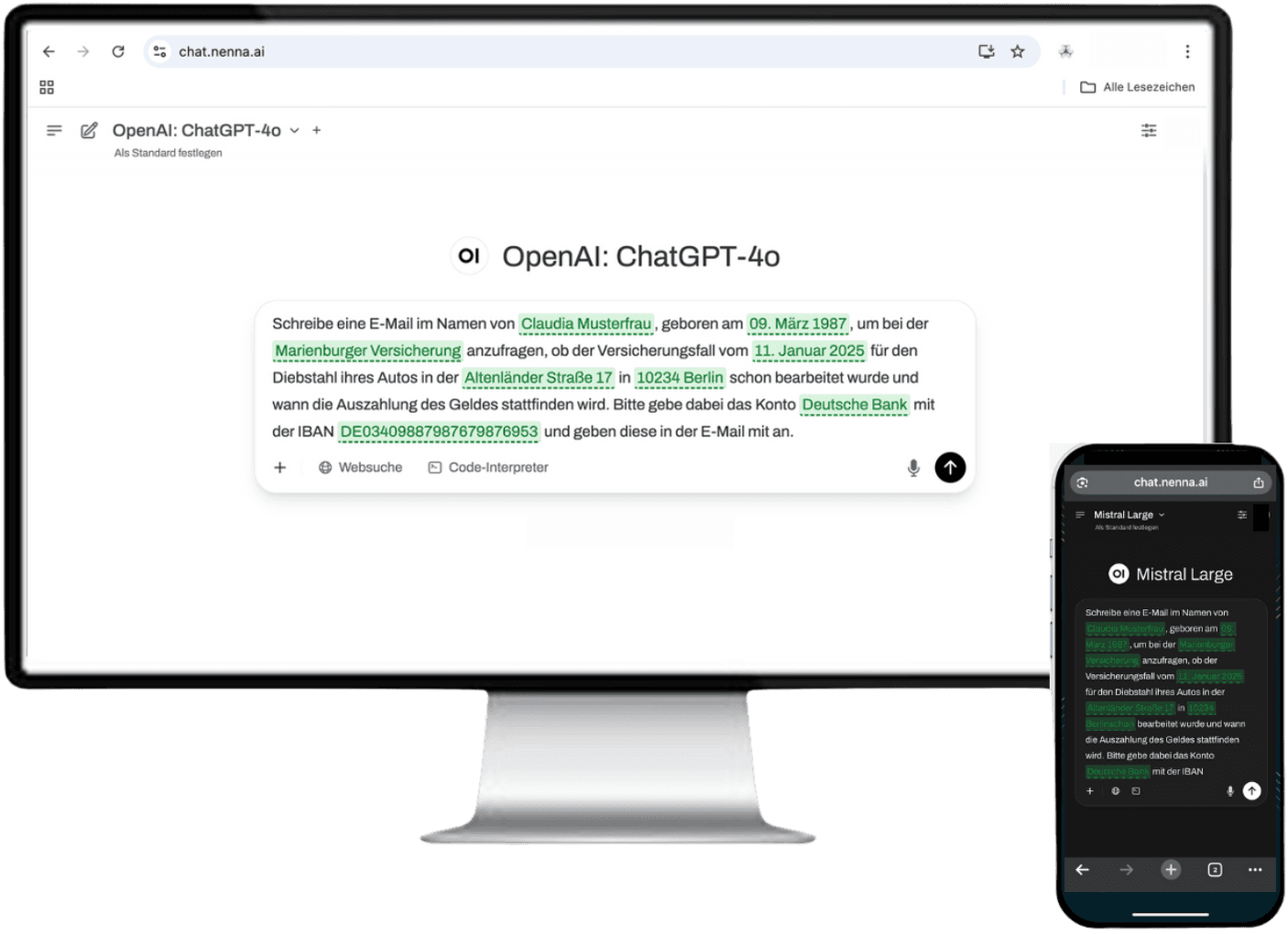 Schattennutzung ade - KI Nutzung im Browser mit NENNA. Daten und Prompts können anonymisiert werden, bevor sie in LLMs eingegeben werden — 100% DSGVO-konform und compliant.
