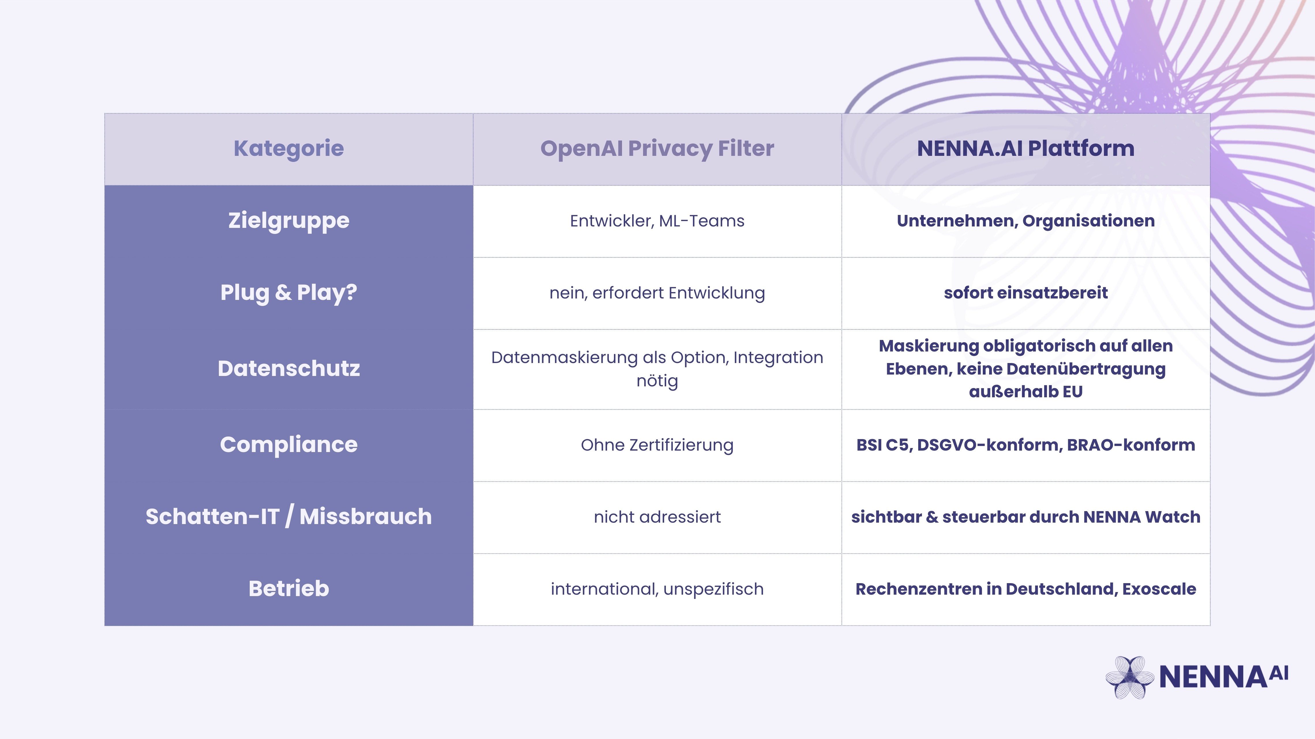 Tabellarischer Direktvergleich: Privacy Filter vs. NENNA Plattform